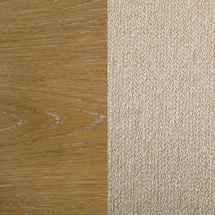 Infuse your kitchen or dining room with the inviting warmth of a modern farmhouse dining set that includes a round table and four side chairs. The set is designed for casual enjoyment and vintage style, complete with a starburst wedge veneer pattern on its charming tabletop. The base of the table adds thick supports, including flared legs and crossing stretchers enhanced with joinery details. The set is ideal for a compact space, seating four comfortably with its 54-inch tabletop diameter. Its brown oak wood finish extends to four side chairs, each with a ladderback and padded seat covered in latte finish upholstery for a versatile look. Key Features: • A five-piece modern farmhouse dining set creates a perfect gathering place for family meals • Starburst wedge tabletop veneer pattern is engaging and stylish in farmhouse or coastal decor • Features oak veneer in a brown wood finish with joinery details that add character • Strong lines define the structure of the table, which boasts flared legs and crossing stretchers • Chairs are a classic ladderback with a seat in neutral beige upholstery over foam cushioning