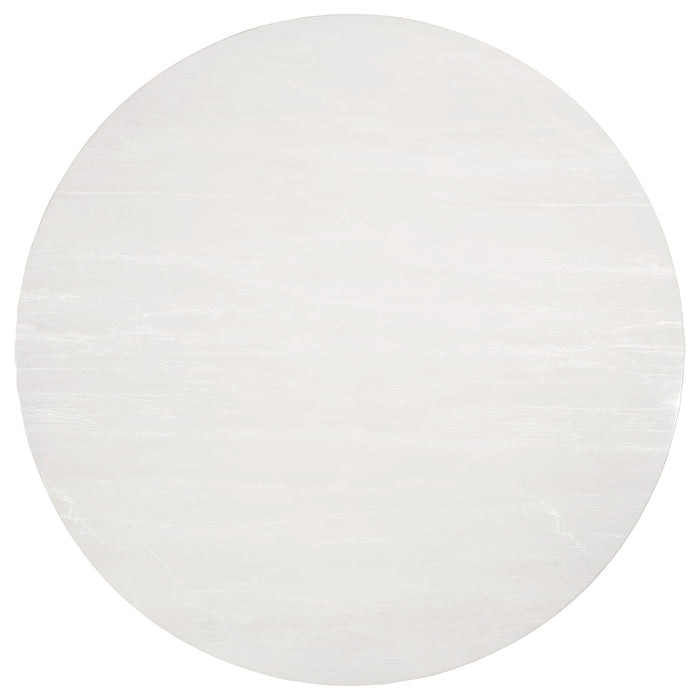 Updated style elements offer a clean look with a wow factor to your contemporary dining room or kitchen with this modern round dining table. A bit on the casual side of glam, this table and its round top fill a need for space-conscious configurations as well as modern optical impact associated with circular shapes. A clean China white top made of genuine marble with engineered marble veneer is slender and sophisticated, perfect for bridging design motifs. Embrace a geometric-inspired gold stainless steel base that becomes a focal point for its brilliance and silhouette. Dress up this chic round table with compatible chairs and accessories that turn your home into a veritable furniture gallery. Key Features: • A popular circular shape tabletop and quirky base shape deliver style intrigue that gets noticed • China white authentic marble and marble veneer create a compelling tabletop with high-end elements • An angled geometric base made of gleaming gold finish stainless steel adds a shapely visual impact • This stylish circular table works in both edgy contemporary settings and retro-influenced spaces • Place this table in a modern kitchen or dining room or tuck into a corner for intimate dining