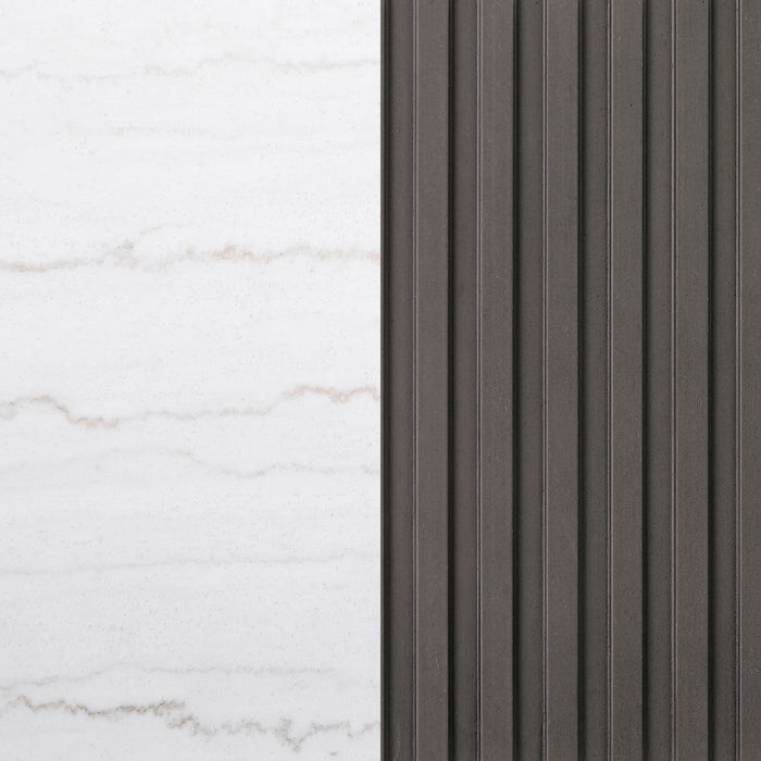 Center your living space with this elegant, modern round coffee table. The genuine white marble top exudes sophistication with its subtle veining, adding organic flair. The clean, light coloration complements any surrounding decor. A ribbed, engineered wood frame in a charcoal finish creates texture and depth, while the brushed gold metal base brings a luxurious touch. This piece seamlessly blends refined materials and design, making it the perfect addition to your living room. Key Features: • Round coffee table with a genuine white marble top and engineered wood frame • Subtle veining on the marble surface adds an organic, sophisticated touch • Charcoal finish on ribbed base enhances texture and creates depth • Brushed gold metal base offers a stylish and durable foundation • Versatile design complements a wide range of interior decor styles • Ideal for adding a contemporary, luxurious appeal to your living room