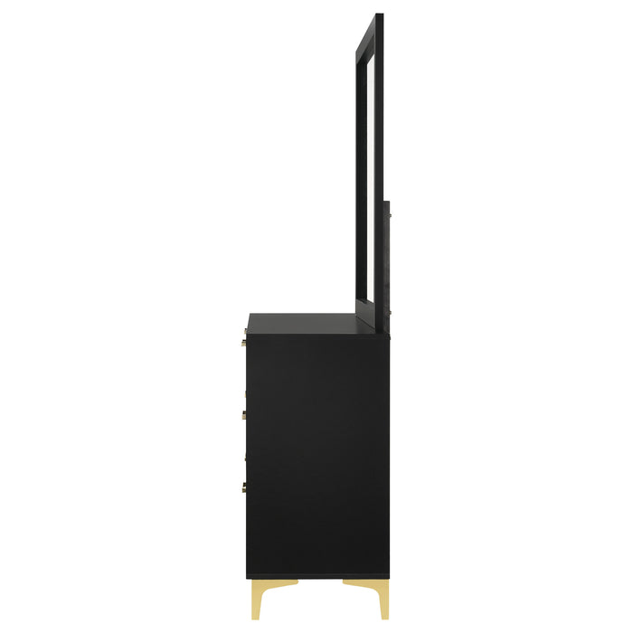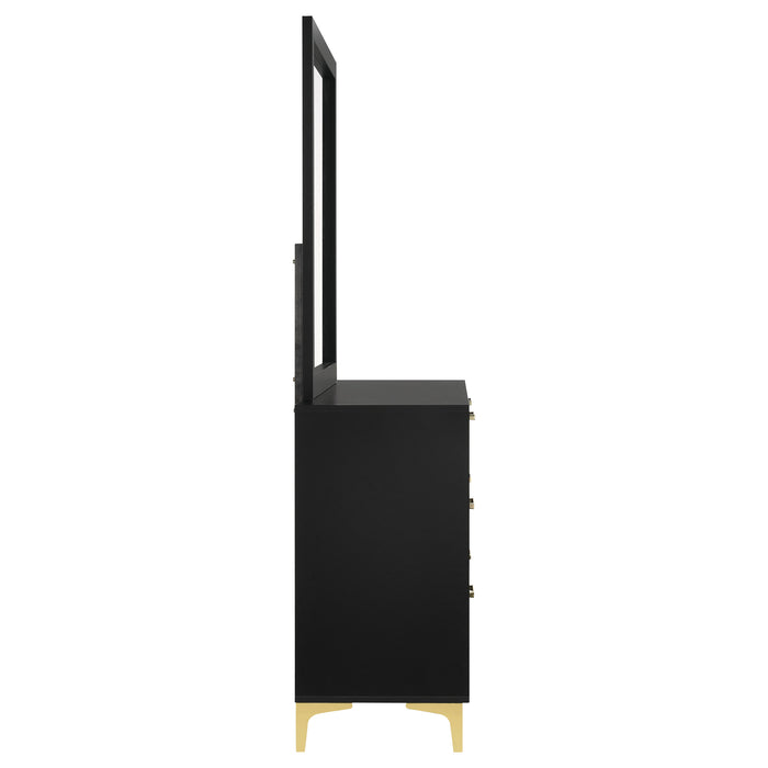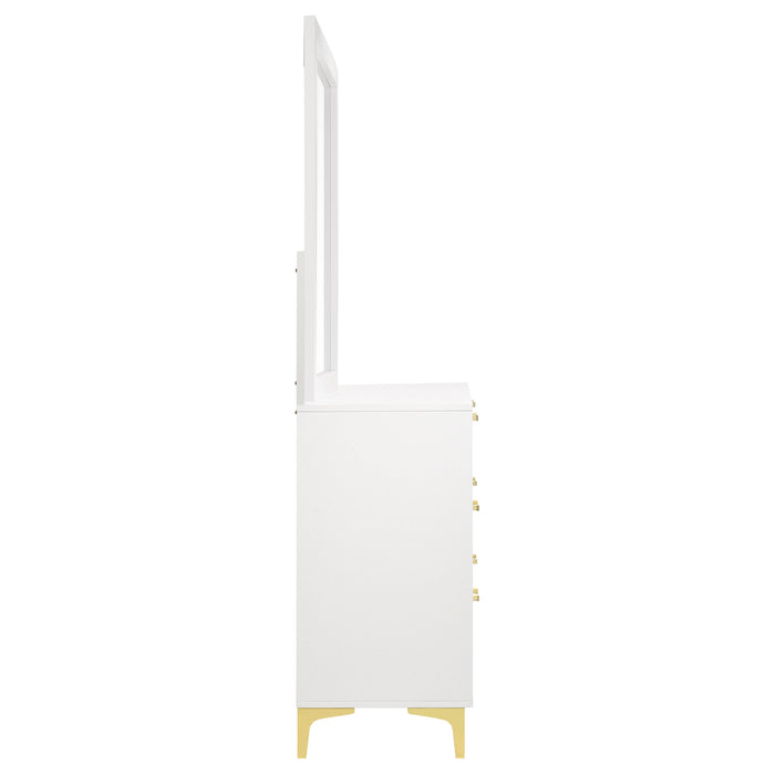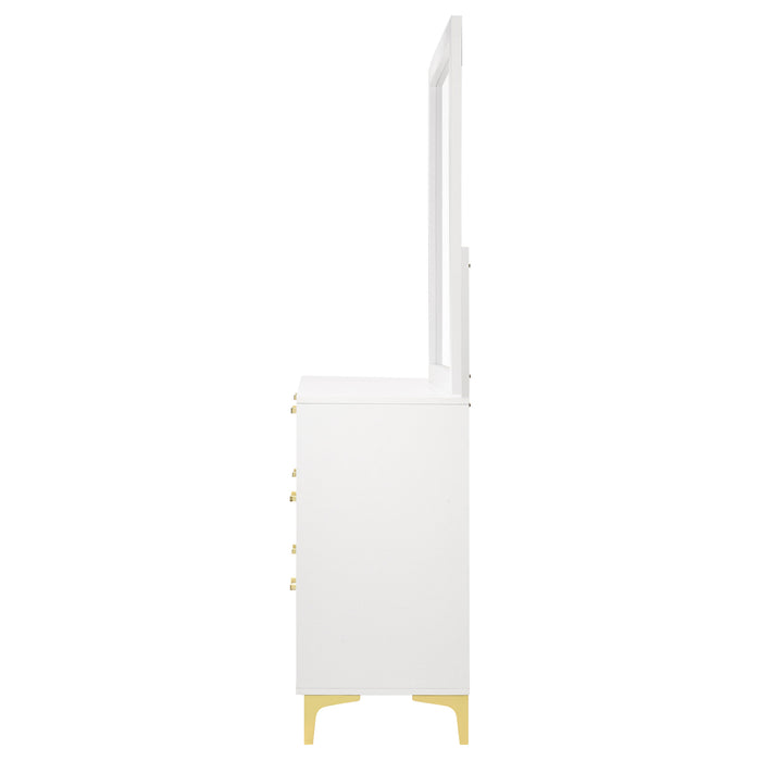 Brighten up your bedroom with the modern glam and cheer of this six-drawer dresser, a statement piece that brings a light and airy feel to contemporary spaces. Gold-finished pulls and bracket-style legs infuse the piece with a touch of luxury, while the crisp white finish keeps it sleek and dignified. Ideal for anchoring your focal wall or complementing a vanity area, this long and narrow dresser is a splendid addition. The accompanying contemporary mirror, framed in white, adds height and elegance, creating a formal vanity when placed atop the dresser. Key Features: • Modern glam six-drawer dresser with gold-finished pulls • Bracket style legs for a luxurious look • Crisp, white finish for a sleek presence • Rectangular contemporary mirror with a minimalist white frame • Adds formal elegance to bedroom vanity areas