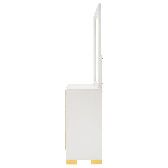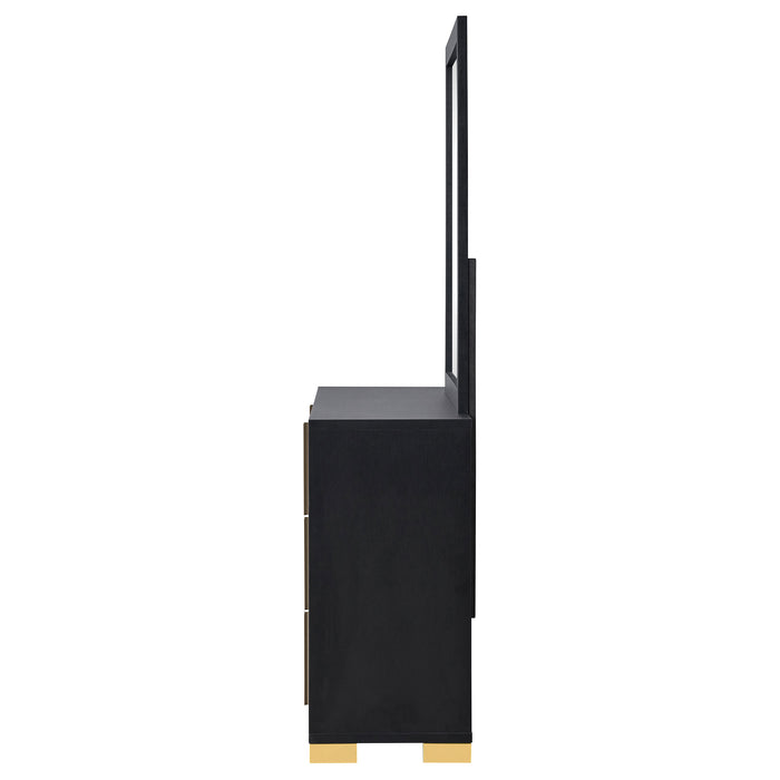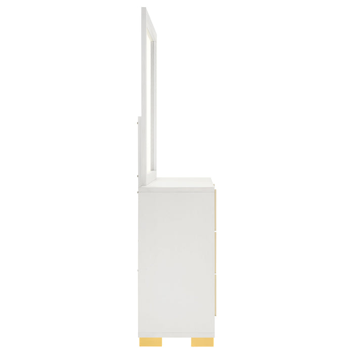 Immerse yourself in the striking elegance of the this dresser and mirror set, a true embodiment of contemporary chic with an Art Deco twist. The six-drawer dresser, crafted with wood products, showcases a captivating vertical design, with gold finish metal accents creating a mesmerizing geometric pattern. The drawers, featuring English dovetail construction, glide smoothly on center metal runners, marrying form with function. Above, the sleek, minimalist mirror, framed in engineered wood and decorative laminate, complements the dresser, its non-beveled glass amplifying the room's space and light. Together, this set offers a harmonious balance of dramatic aesthetic and practical elegance, transforming the bedroom into a modern-day sanctuary. Key Features: • Six-drawer dresser with a modern Art Deco vibe and ample storage • Versatile finish with gold finish metal accents for a geometric effect • Drawers with smooth center metal glides and English dovetail construction • Vertical gold metal drawer hardware for a unique impact • Dresser mirror with a minimalist design and sturdy frame
