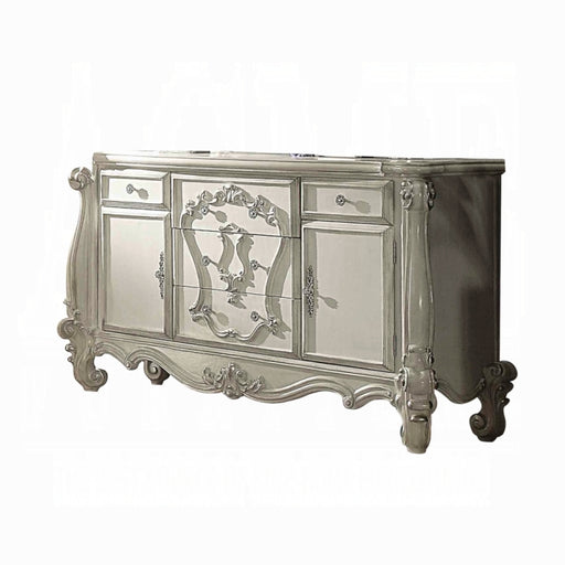 ACME Versailles TV Console, Antique Platinum (For Flat Screens TV's up to 72 Inches), 74" x 21" x 31"H, 154lbs. The Versailles the TV Stand was inspired by old European design. This collection features carved scrollwork accent on legs and trim base. Carefully crafted with selected wood and veneers in antique platinum finish with hand brush accents. Offers plenty of space to keep your entertainment components. This TV Stand will give a royal sensation to your living room. Features: - Rectangular TV Stand - Storage: 3 Doors with 1 Shelf Inside - Max. Size Recommended: 72" Flat Panel TV - Cord Mgt (Back Panel with Pre-Cut Hole) - Oversized Raised Scrolled Molding and Leaf Crown Motif with Antique Hand Brush Finish (Poly-Resin), Wooden Case-Frame, Oversized Scrolled Post-Leg - Collection Versailles Materials: Wood, Poly Resin, Glass, Wood Veneer